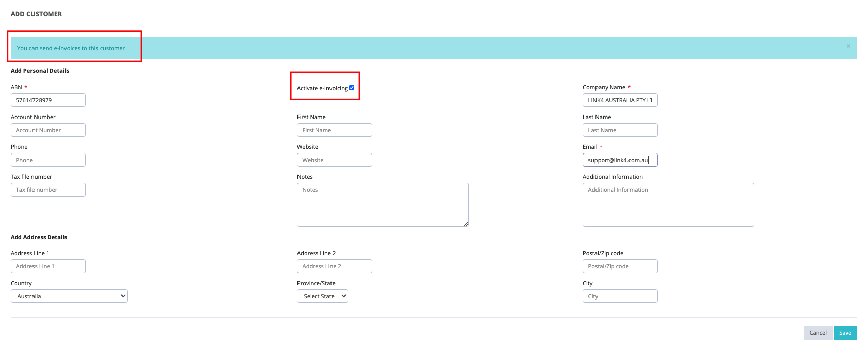 E-invoice functionality will also be automatically enabled for the customer you have added.
