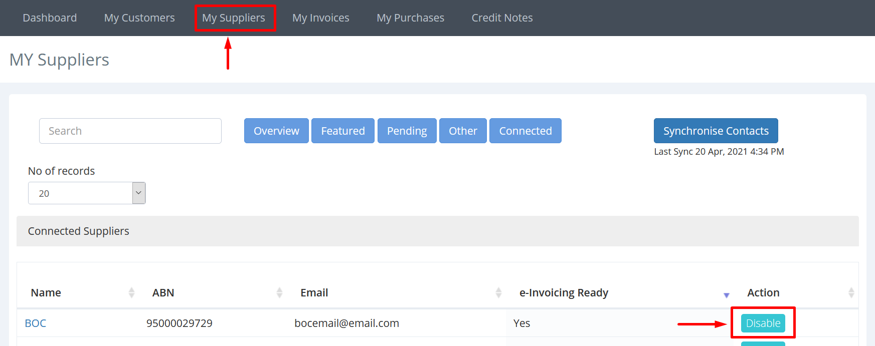 with the supplier. This is indicated by the "Disable" tag under the Action