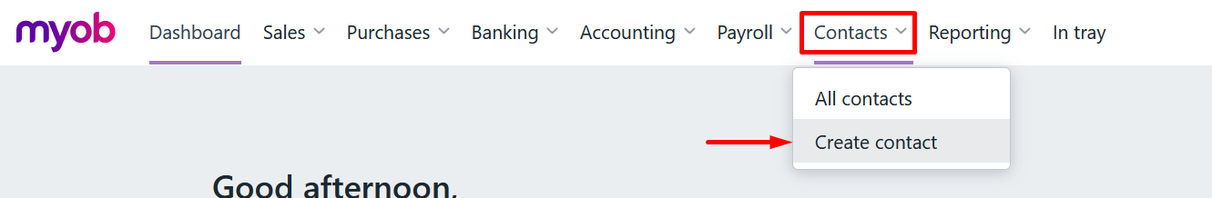 Step 1 Log in to your MYOB Essentials account, click on the "Contacts" menu, and select "Create contact".